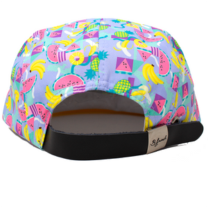 Got snacks on the brain! Fruit snacks to be exact. Feed your style with the Fruit Snacks retro 5 panel cap. Pastel color ways, yellow brim, and black faux leather strapback. Stand out from the rest of them baes who think they’re a snack and be sure that your someone's favorite snack! Fruit Snacks never disappoint. Fresher than the banana in the pattern, the B Fresh Fruit Snacks camper hat. Head-ware that gets compliments!