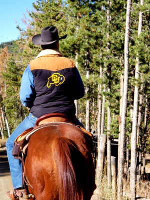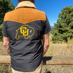 You're buff! A strong CU buff. What better way to show your buff pride than a sleeveless puffer vest? Let the other side know you're packing some battering rams and you're no stranger to beating down the sheeple who stand in your way! As if those biceps weren't warning enough, this Ralphie vest literally has your backside covered! Go forth young champ, for ye shall not lose! Draw strength from the armor of thy countrymen. Courage and confidence bestowed upon ye under the iron clad vintage CU Buffaloes vest. Not just an 80’s ski vest for championing the highest peaks. Not just a western vest for wrangling the sheep. Not just a vintage Buffs vest for brisk morning strolls to Norlin. Alas, the best of worlds has collided with this curiously warm, battle tested, NCAA licensed CU puffy vest. University of Colorado merch that let's the other side know, you're Buffaloe strong!
