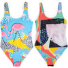 What happens when two flamingos walk into a porthole set for the early 90's? They wind up on a silky smooth, totally radical, reversible women's one piece swim suit; that's what!
